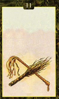 Карта Птицы, которая бывает часто представлена совами, в данном случае содержит изображение птиц. Птицы здесь красочные, сидящие на большом зеленом дереве, т.е. обстановка благоприятная и участники ситуации - персонажи положительные. В карте присутствует легкость, поэтому в значениях может проявляться некоторая несерьезность или легкомысленность, обсуждение "водушных замков". Но, в целом, это приятное общение. Мрачных энергий и таких элементов как сплетни и злые разговоры в карте Птицы нет. Они могут проявляться разве что в сочетании с негативными картами.